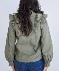 Karlie women Poplin Ruffle Button Up Shirt in Olive