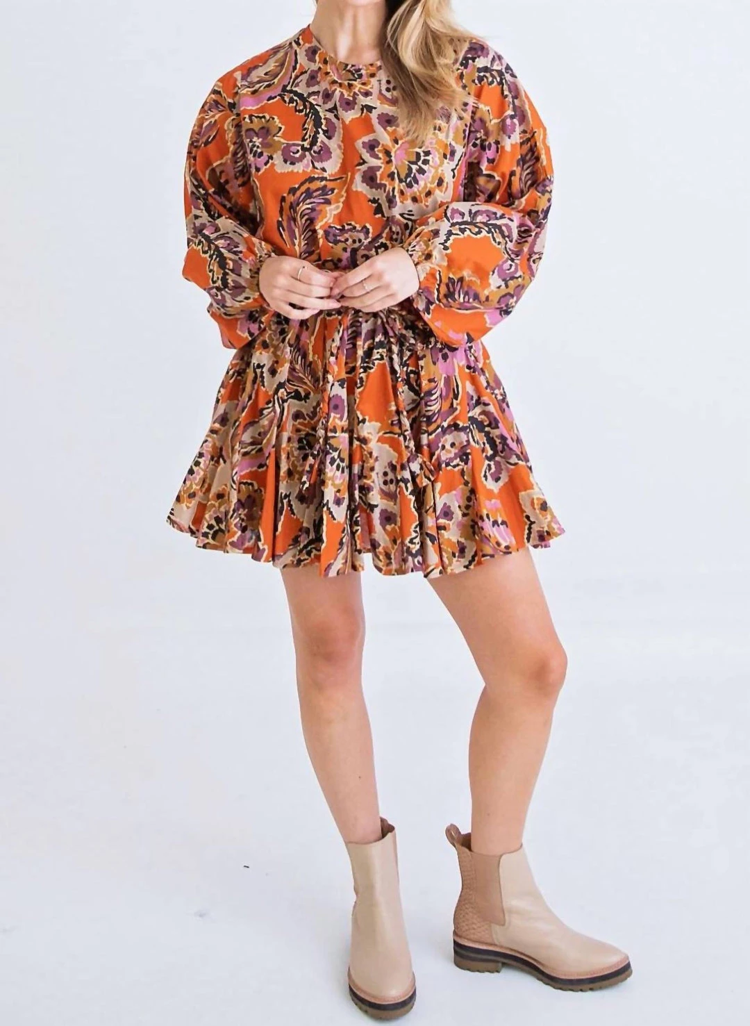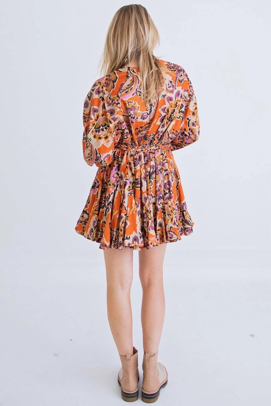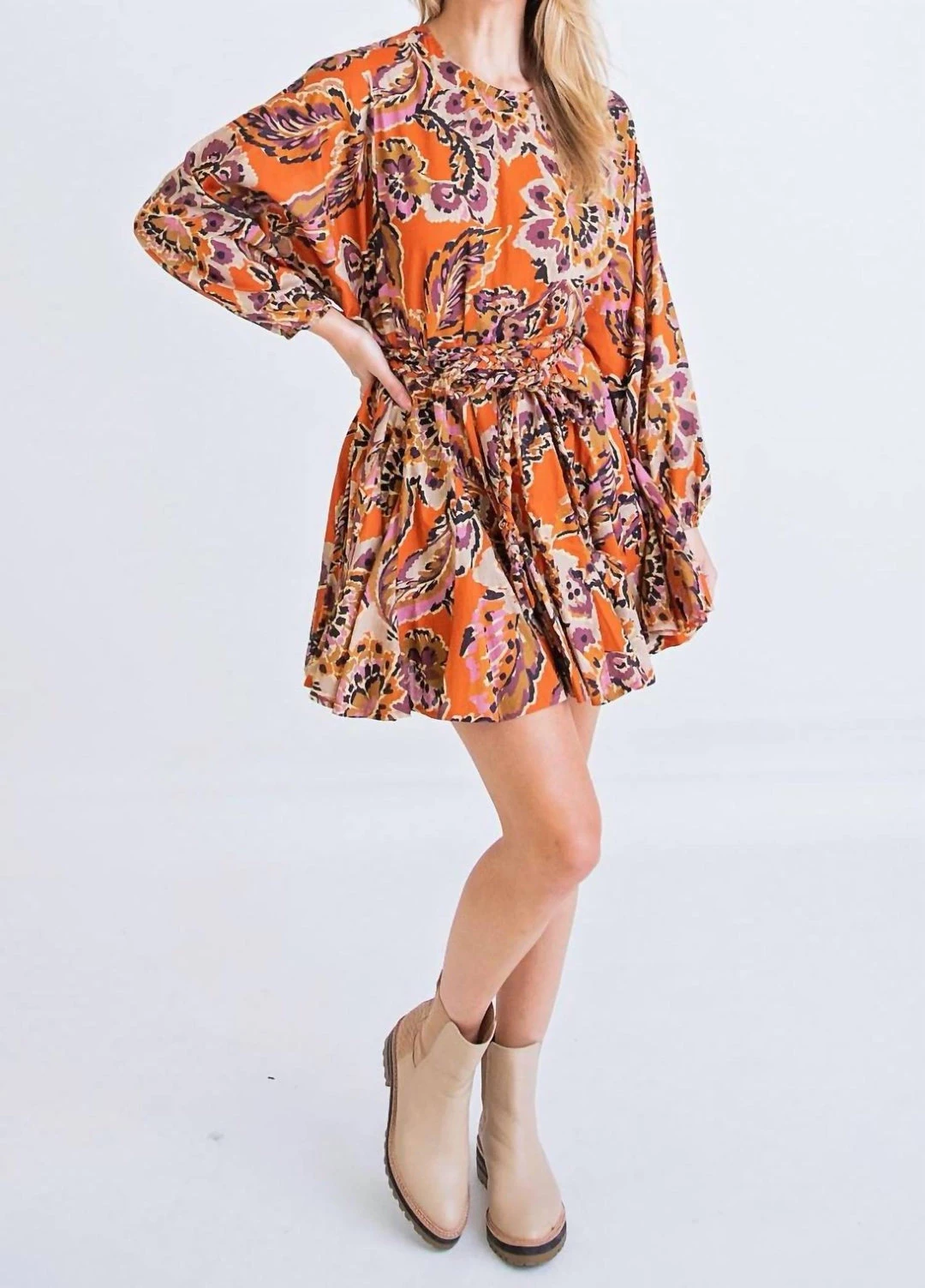 With rope belt.Abstract PrintBraid BeltTie WaistCrewneckLong SleeveLined Model is 5’5″, wearing a small.
