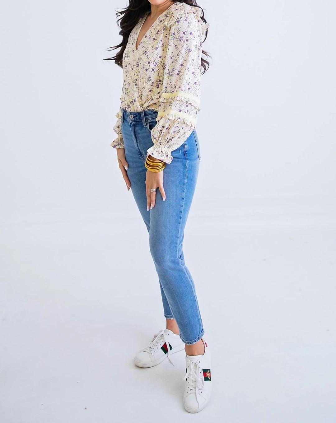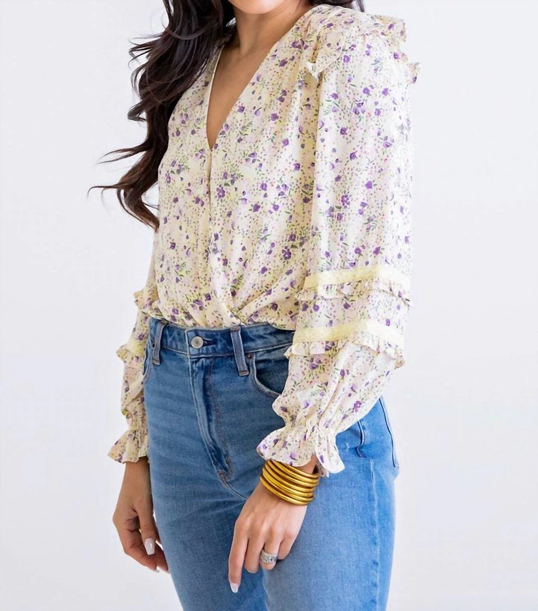 Fits True To SizeVneckFloral PrintRuffle DetailLong SleeveBodysuit snaps between legs