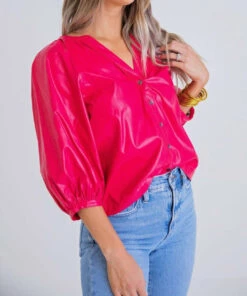 Karlie women Faux Leather Button Down Top in Cranberry