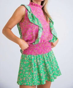 Karlie women Floral Vintage Ditzy Ruffle Top in Pink/Green