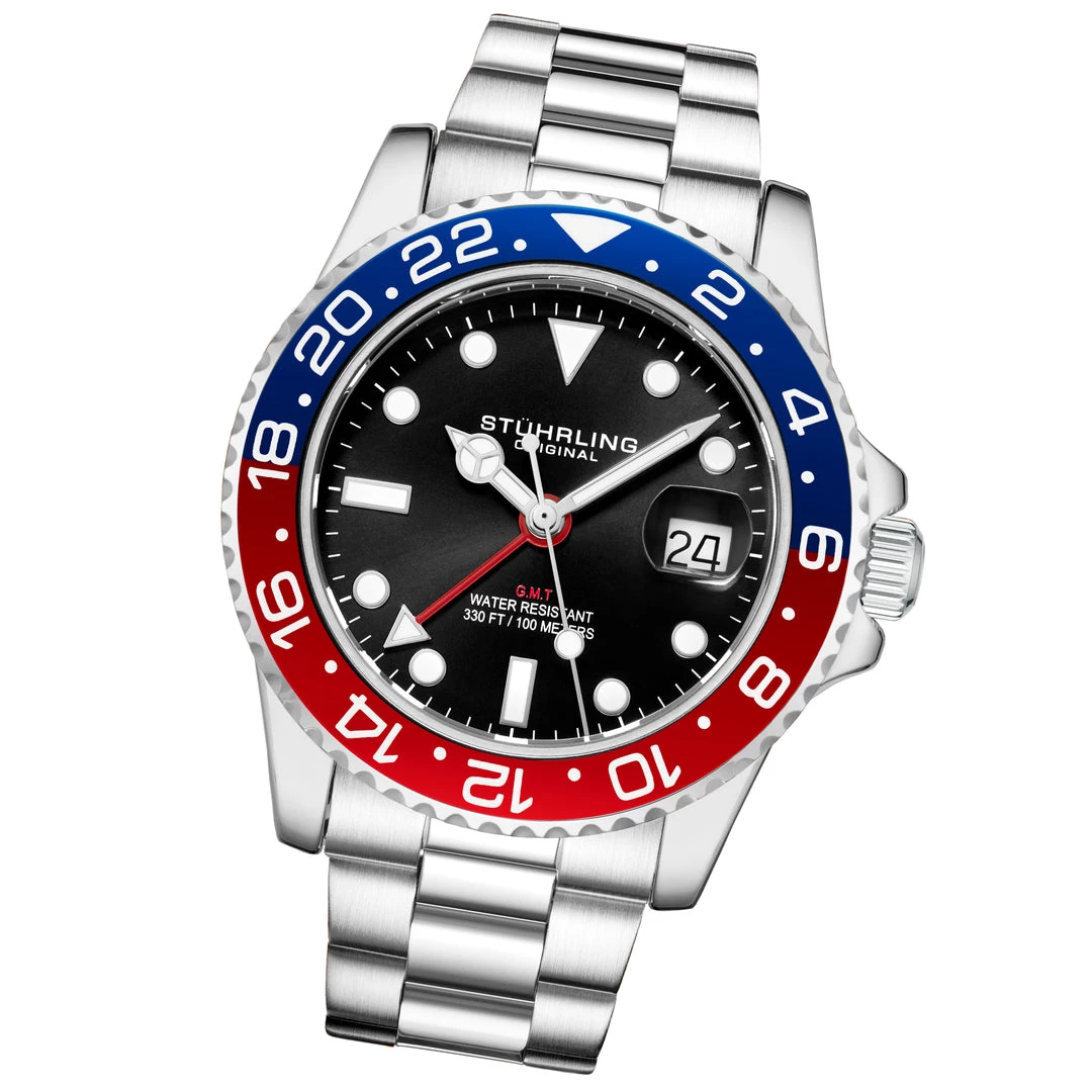Men’s Quartz Diver Watch. This watch has a, Silver Case, Blue And Red Bezel, Black Dial With Red Accents, and Luminous Silver Hands And Markers, on a Silver Bracelet Watch.