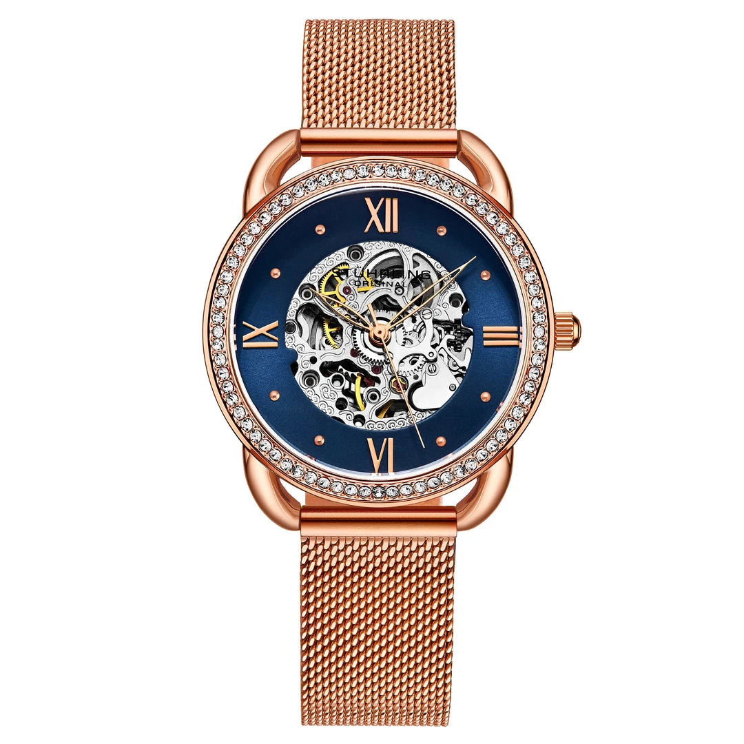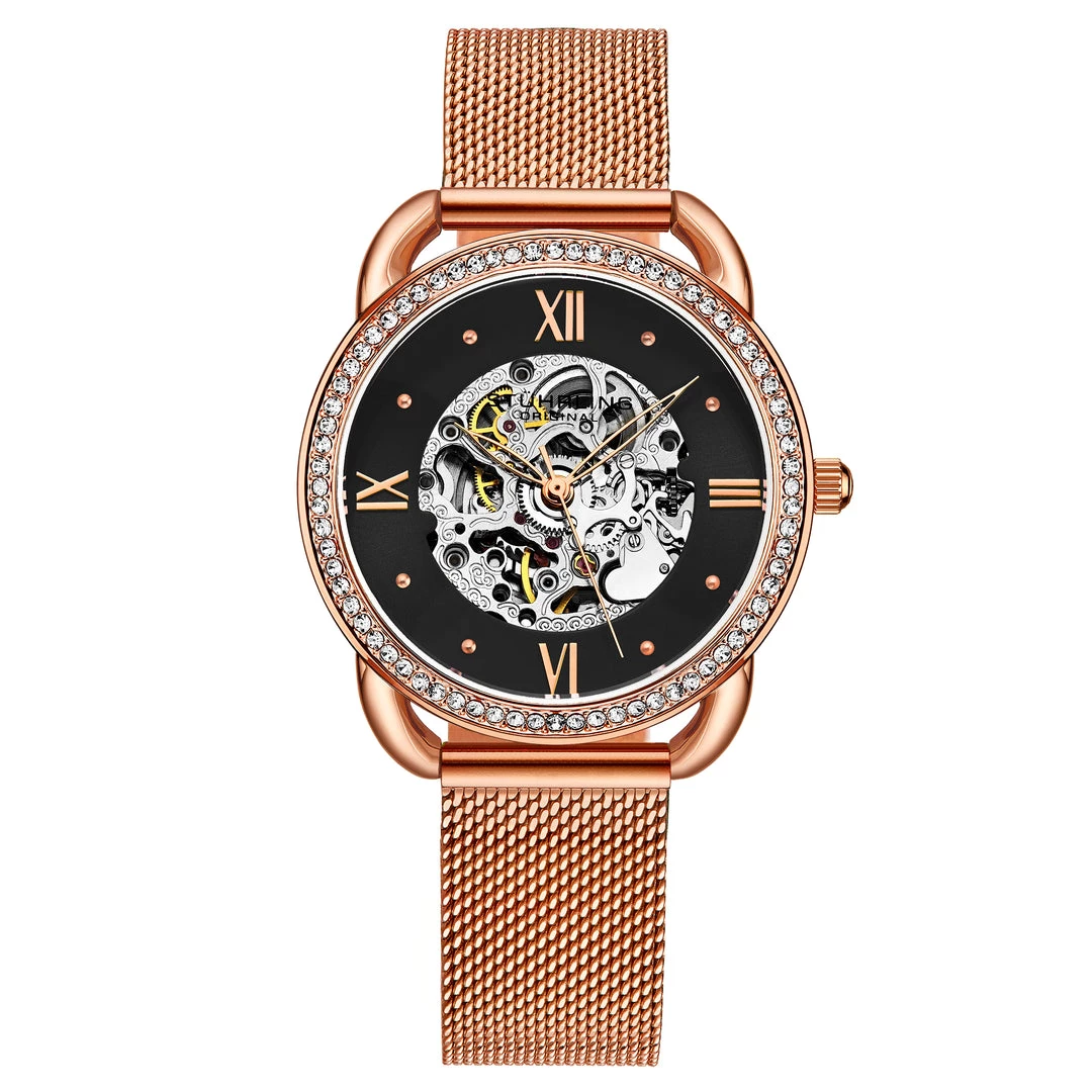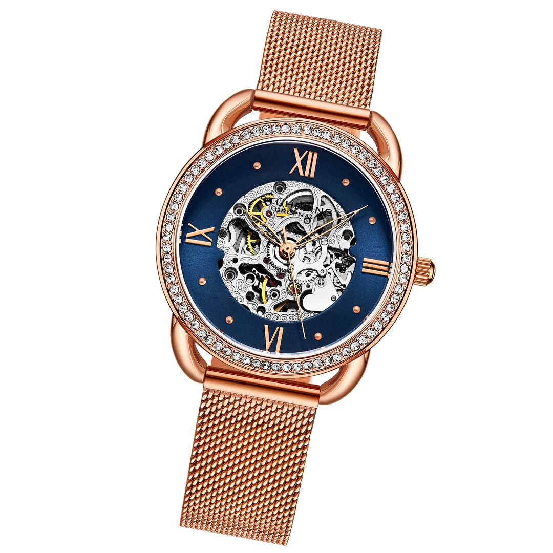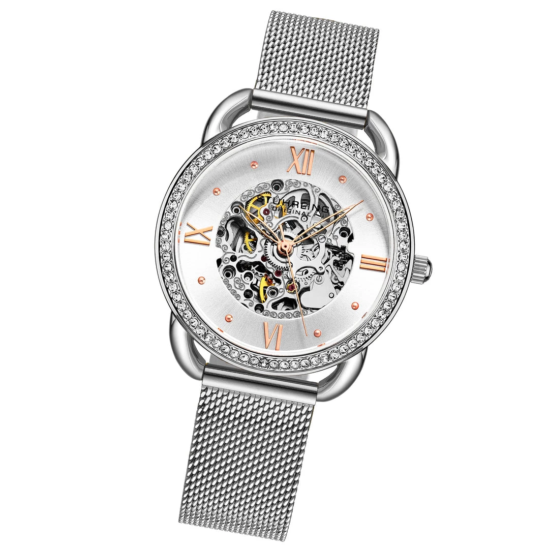 Ladies Automatic Skeleton Watch. This watch has a Silver Case, Silver Crystal Studded Bezel, Silver Dial, Rose and Gold Hands and Markers, on a Silver Mesh Bracelet Strap Watch.