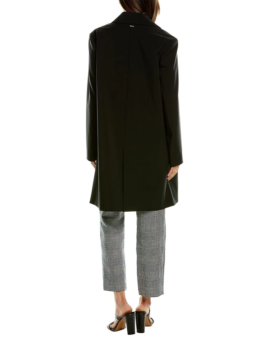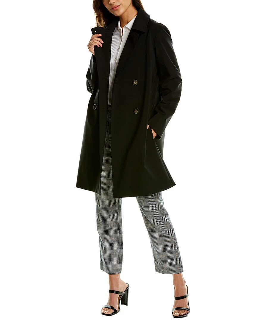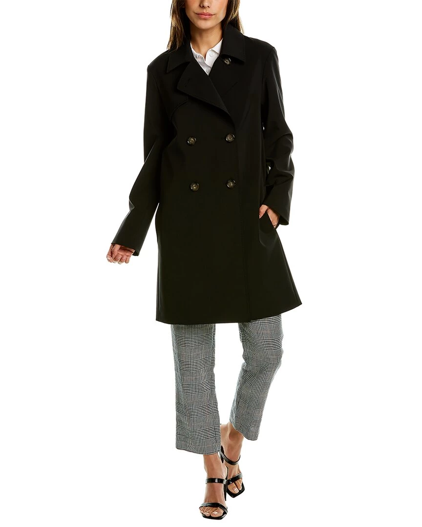 - Medium Length Double Breasted Coat In Black With Spread Collar, Storm Flap Accents, Two Front Pockets And Center Vent At Back Hem