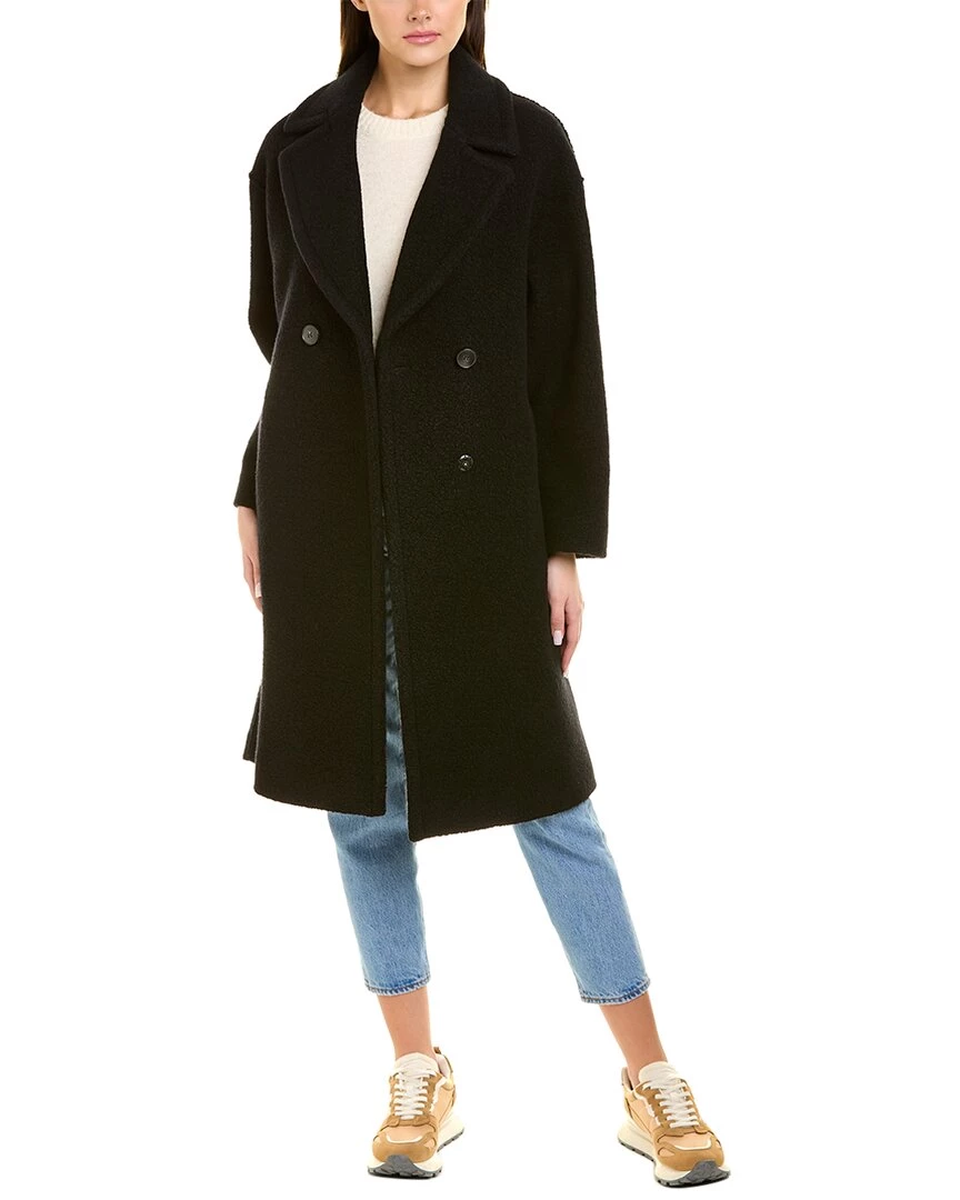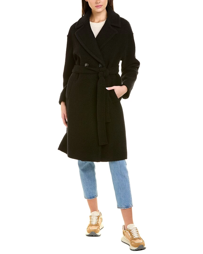 - Teddy Wool-Blend Coat In Black With Belted Waist And Two Front Pockets