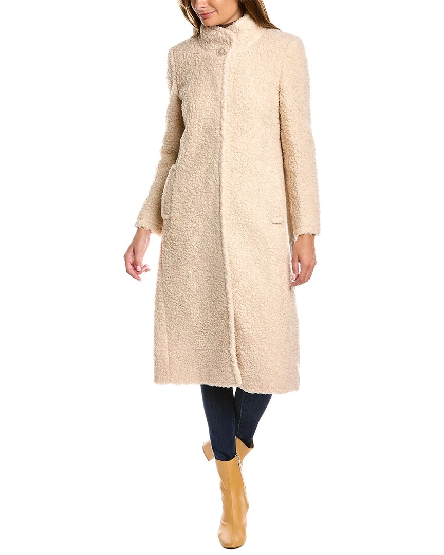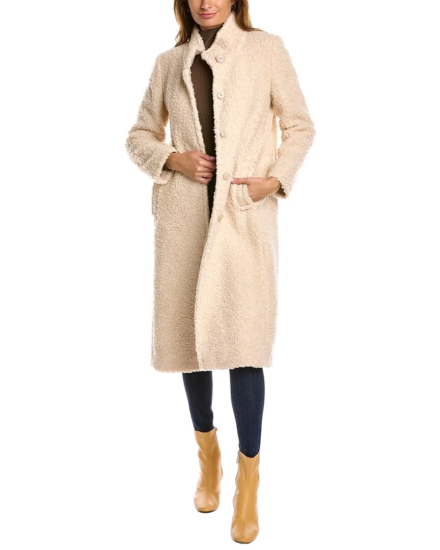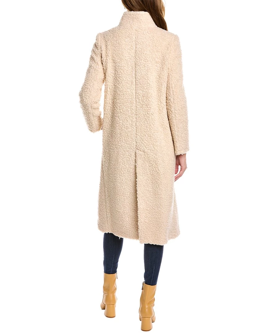 - Wool-Blend Teddy Coat In White With Stand-Up Collar, Front Slip Pockets, And Center Vent At Back Hem