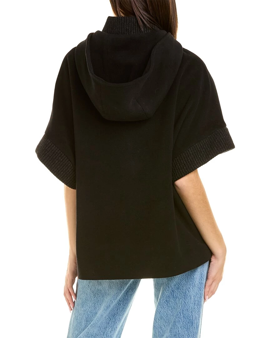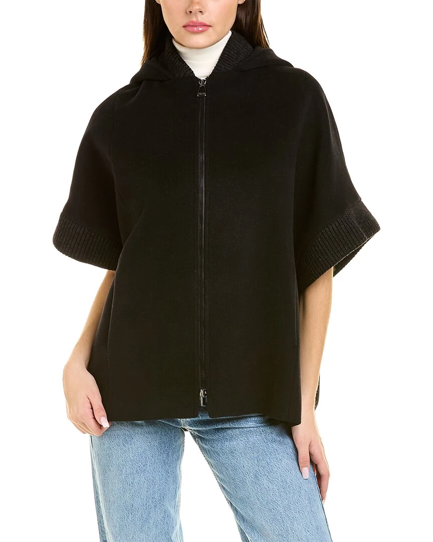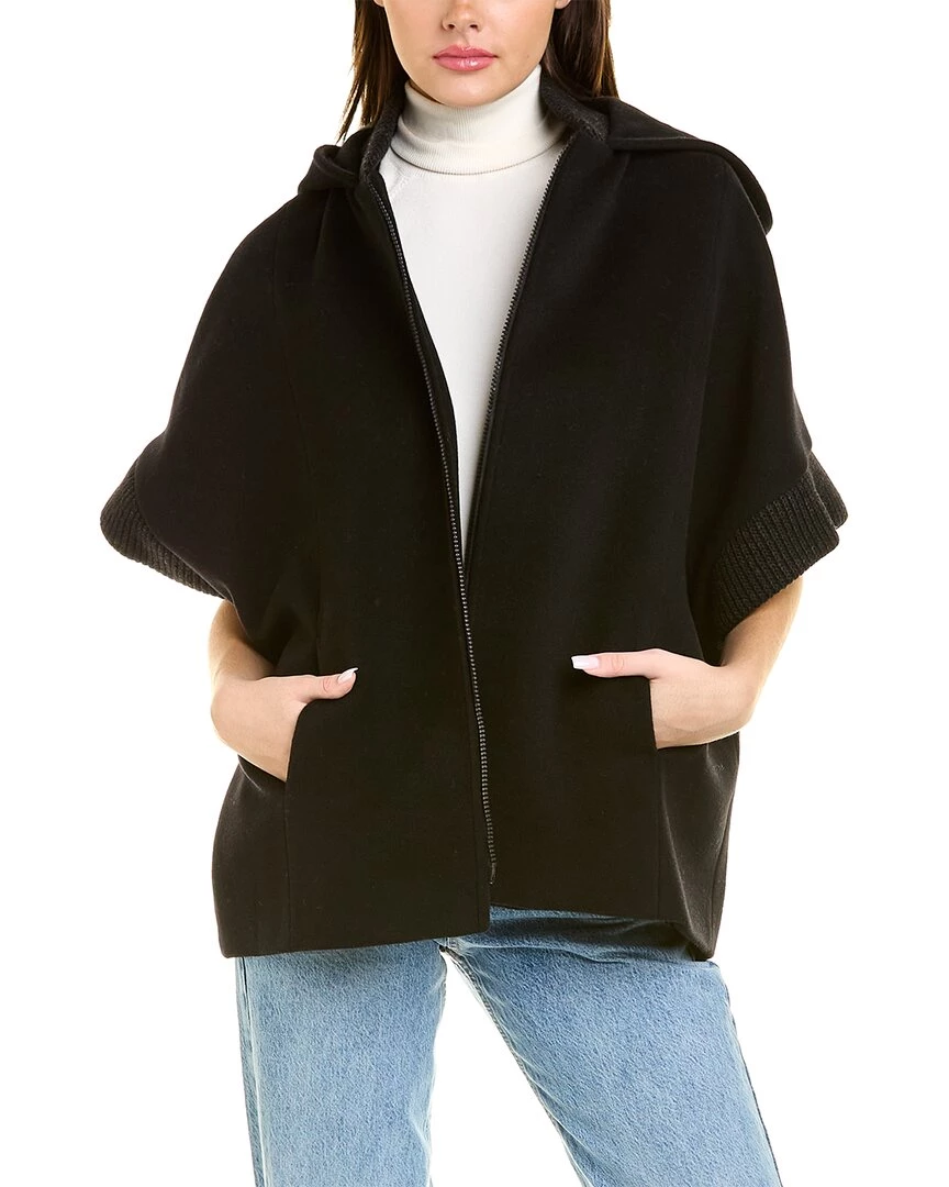 - Wool & Cashmere-Blend Cape Coat In Black With Hooded Back, Ribbed Trim, And Two Front Pockets